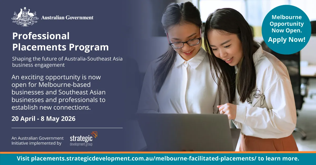 The Melbourne Facilitated Placements Program is a three-week initiative bringing together Melbourne host businesses and early- to mid-career professionals from Southeast Asia. Through a combination of group activities, industry visits and hands-on placements within Australian businesses, the program builds practical experience, cross-cultural capability and long-term regional connections.